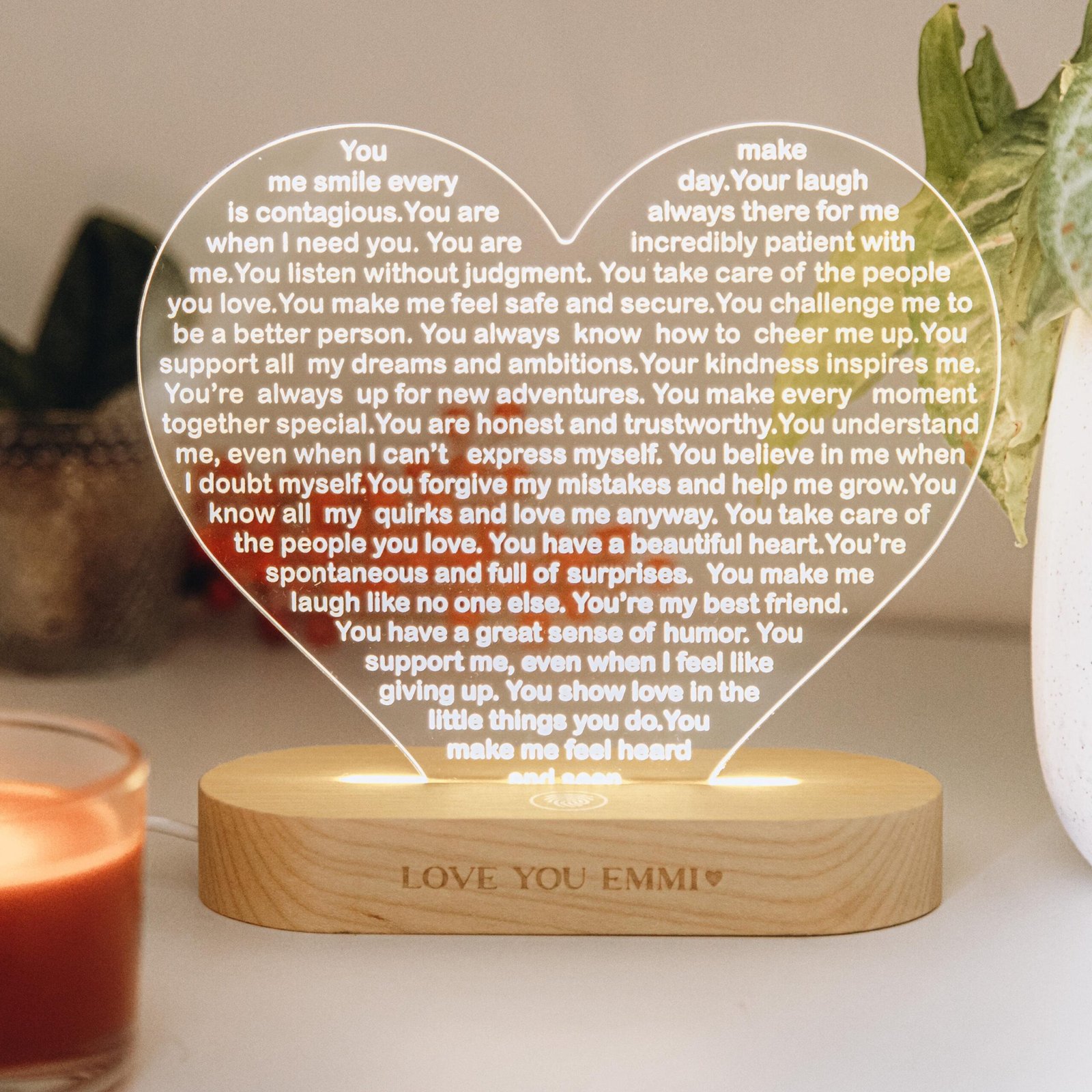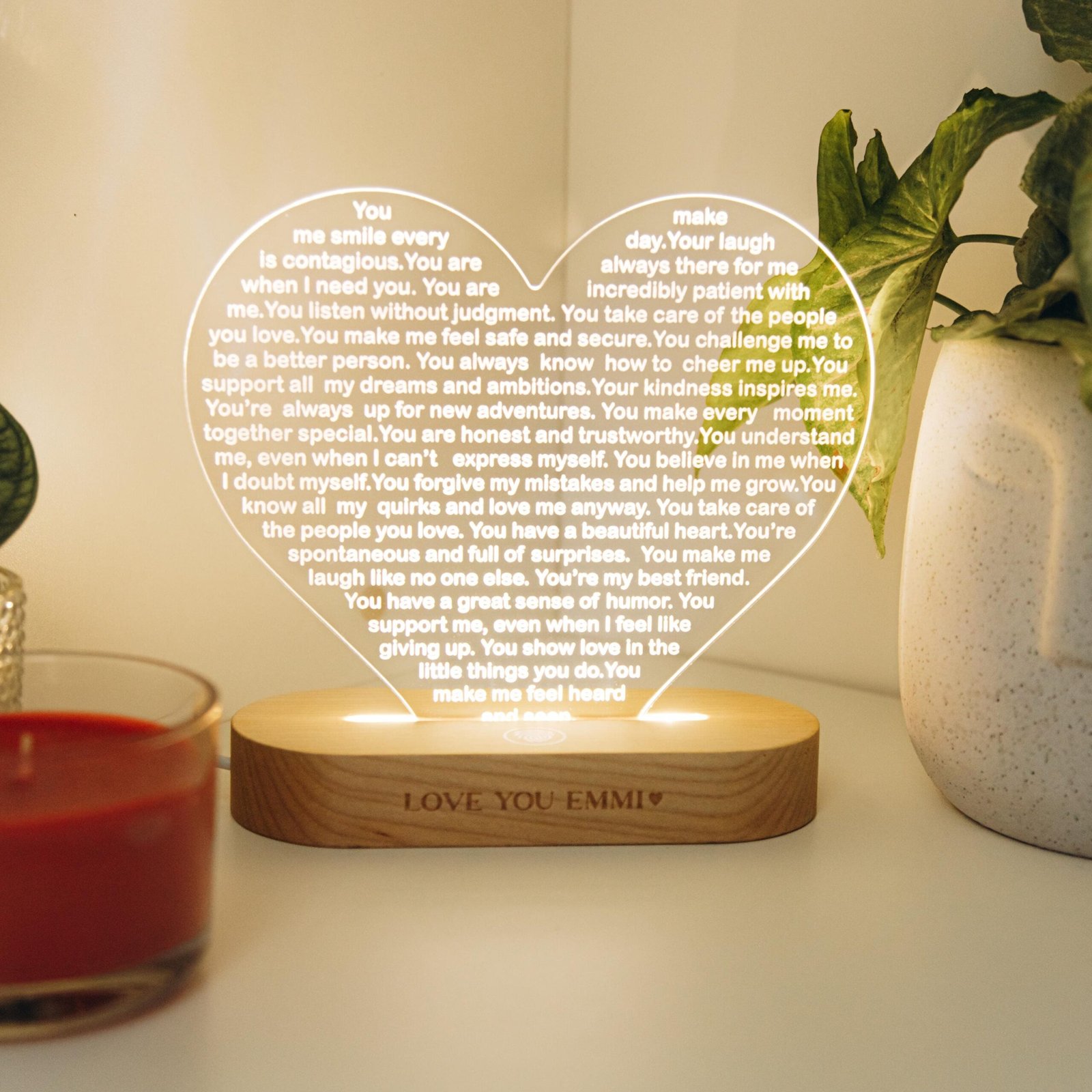 Light up her world with a custom heart night light—a perfect Christmas gift, a thoughtful 30th birthday surprise, a romantic gesture, or a touching anniversary present. Let love shine bright in the form of this personalized night light that symbolizes your deepest affections and conveys your heartfelt emotions in a warm and luminous way. Illuminate her heart and space with a gift that radiates love and togetherness.